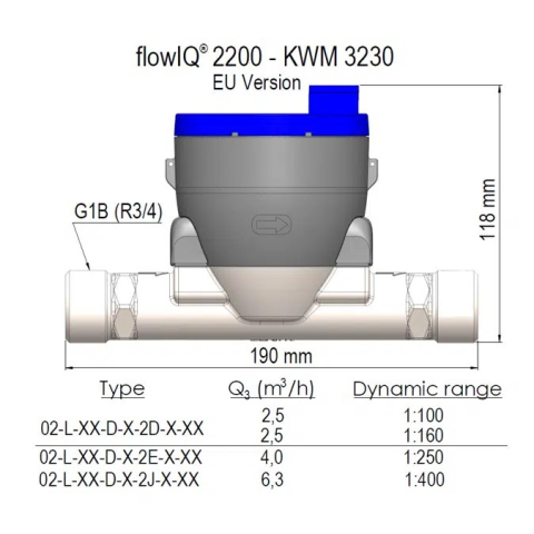 Q3 2.5 m³/h - G1B (R¾) - 190 mm - DN20 - PN16 - Rostfritt stål